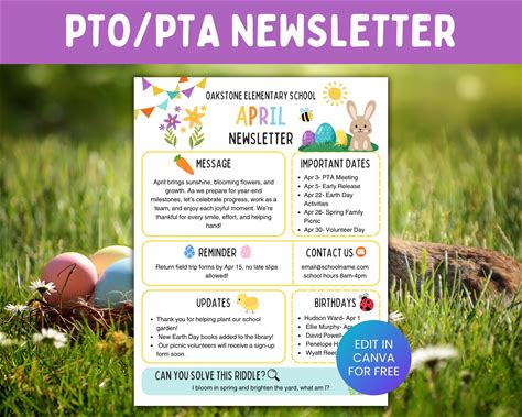 Editable April Newsletter Template, Spring PTO PTA School News, Canva Template