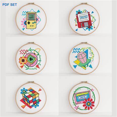 Retro 90'S Set Of 6 - Modern Cross Stitch Pattern PDF, Gameboy, Floppy Disk, Tamagotchi, Cassette Tape, Rubix Cube, Ringpop