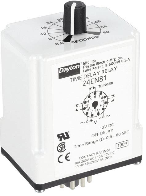 Dayton Single Function Time Delay Relay: Socket Mounted, 12V DC, 10 A, 11 Pins/Terminals, Off Delay Model: 24EN81