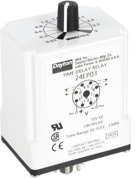 Dayton Single Function Time Delay Relay: Socket Mounted, 12V DC, 10 A, 8 Pins/Terminals, On Delay Model: 24EP03